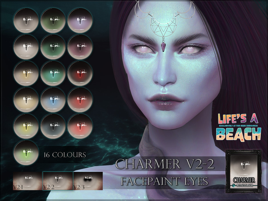 Charmer, facepaint eyes in 15-16 colours, with and without pupils, with light and dark sclera, for occult sims like sirens and mermaids sims.