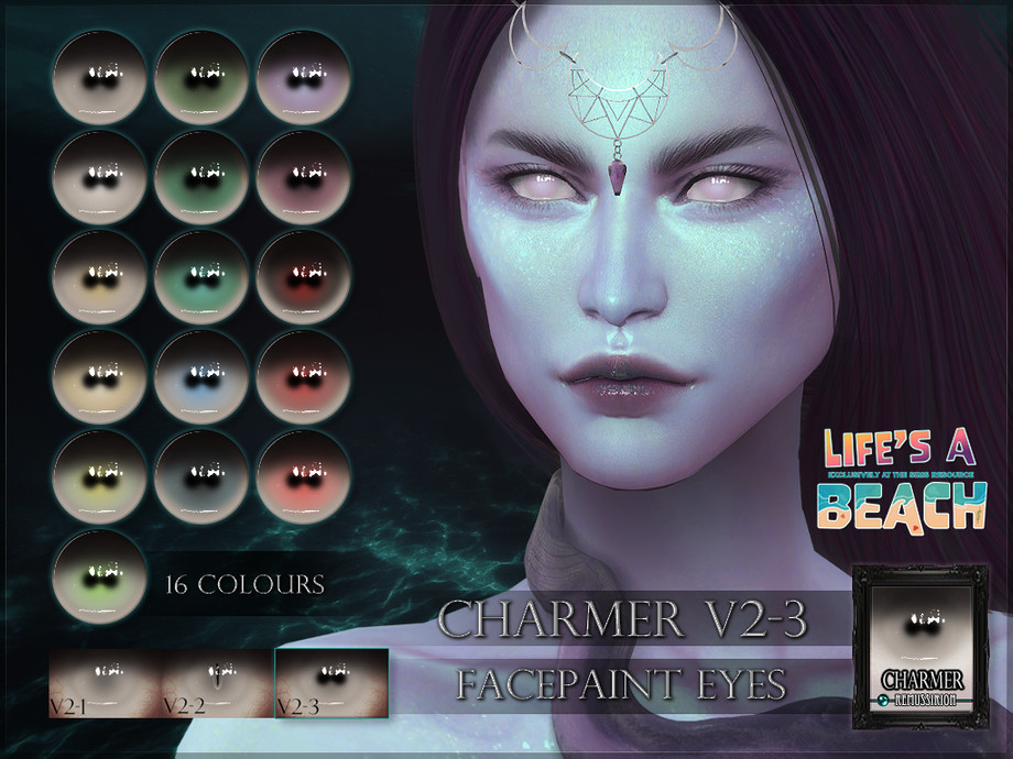 Charmer, facepaint eyes in 15-16 colours, with and without pupils, with light and dark sclera, for occult sims like sirens and mermaids sims.