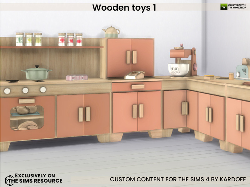Toy kitchen, complete with cooker, cabinets, sideboard, washing machine, functional sink, mixer, coffee maker and decorative clutter.