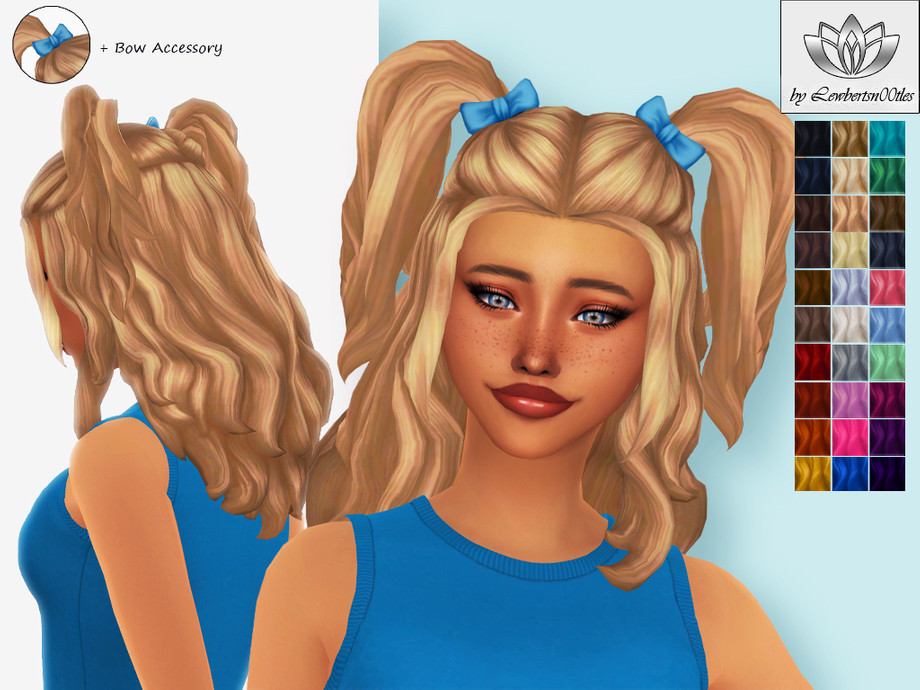 A fun, double-ponytail, up-do hairstyle with a little bow accessory (add-on).