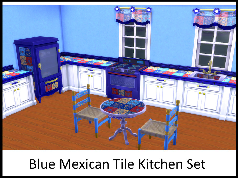 Back to cobalt blue! This Mexican Tile Kitchen Set is both lively and inviting. Why settle for plain appliance when you can get stylish blue ones? Comes with stove, sink, counter, fridge, table and curtains. Matching chair can be found in the base game.