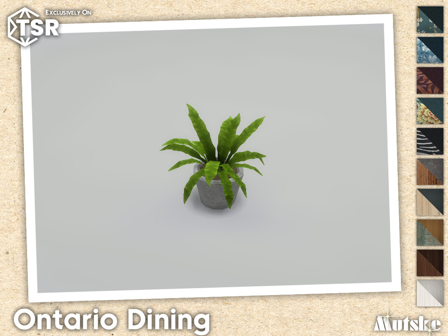 Ontario Diningroom set with seating, surface and more, some have slots to put clutter on. Make sure that your game is fully patched and up to date for this set to show and work correctly in the game. Have fun playing!