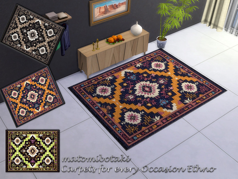 Who doesn't need them, carpets for every occasion, whether classic, modern or ethno, each type comes in 3 different color variations and with custom thumbnail, created for Sims 4 by matomibotaki.