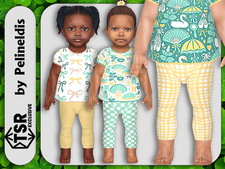 Kids fashion clothing: five blouses and leggings for infants girls with girlish prints in various shades of yellow, green and white.