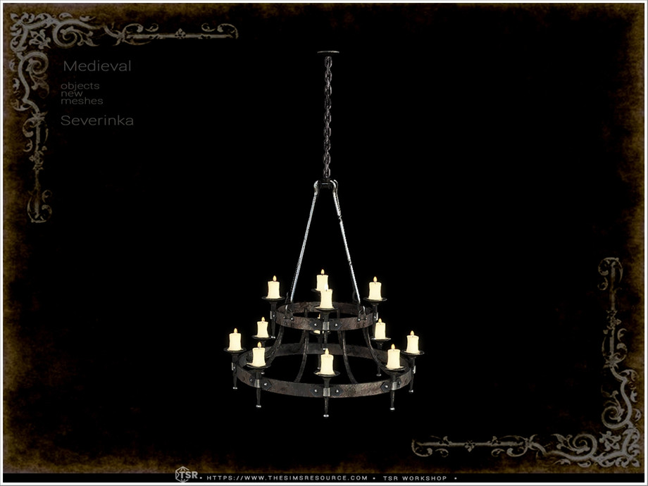 Dining table, dining chair, backless stool, candeliers with candles (for medium and high walls), torch with flame, wooden bowls, wooden mug.