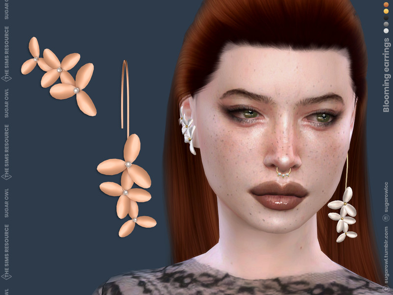 Female asymmetric earrings with blooming petals and pearls. Come in different metal colors: gold, silver, and bronze.