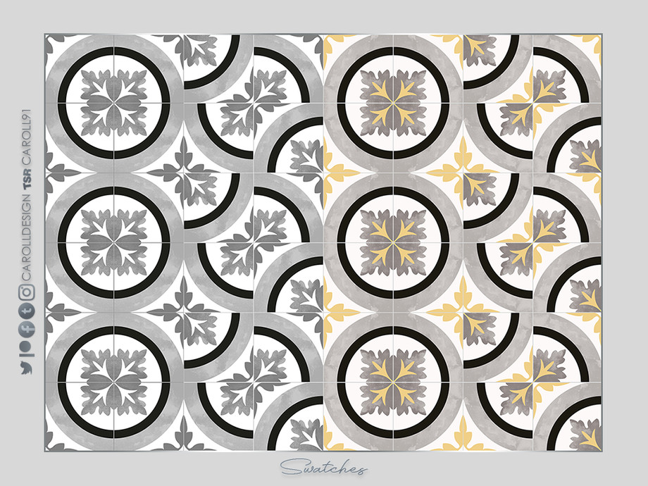 A 4-swatch tile floor with geometric and optical illusion design in shades of grey, yellow and black. Suitable for indoor use, especially bathrooms and kitchens.