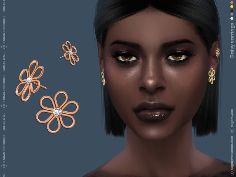 Flower earrings with piercing and diamonds for female sims. Come in different metal colors: gold, silver, and bronze.