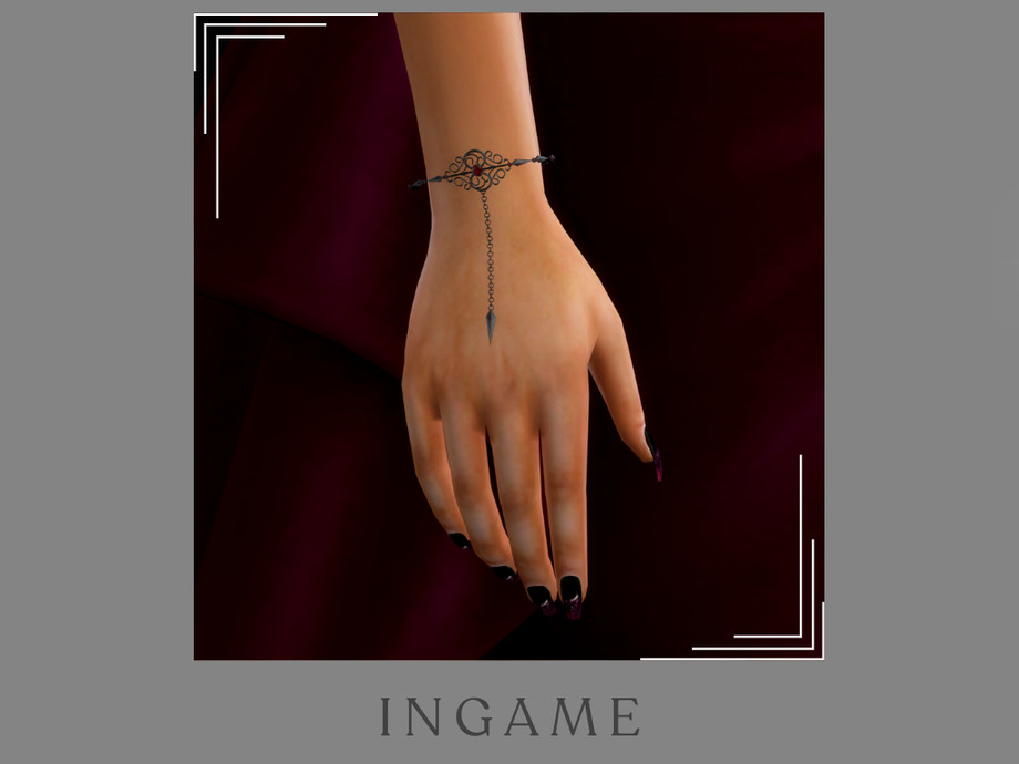 A right hand wrist bracelet with black metal and rubies