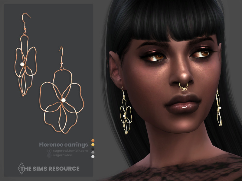 Wire flower earrings with a small pearl, for female sims. Available in different colors: gold, silver, copper, red, blue, purple, and fuchsia.