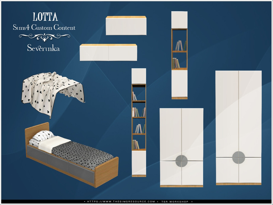 8 items: single bed - blanket - wardrobe (for short and medium walls) - bookcase (for short and medium walls) - the upper cabinet (2 options)