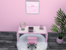 This set has a desk, chair, wall art, laptop, lamp, pen holder, & a plant.