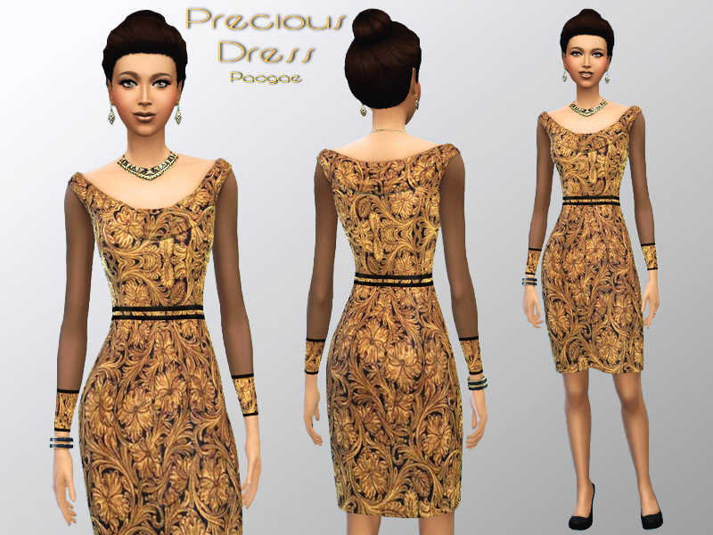 A precious fabric for an elegant dress, knee length, long transparent sleeves, same fabric cuffs, small belt.