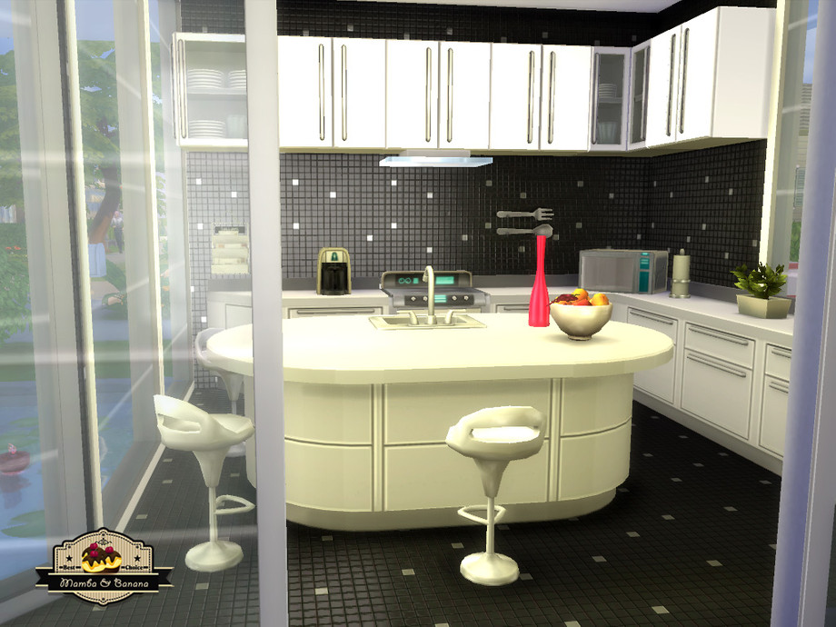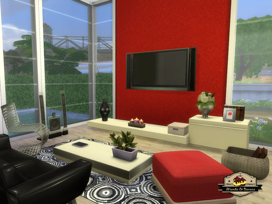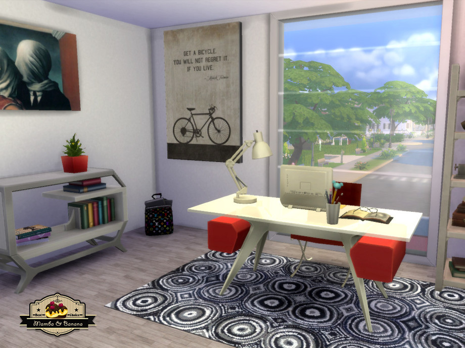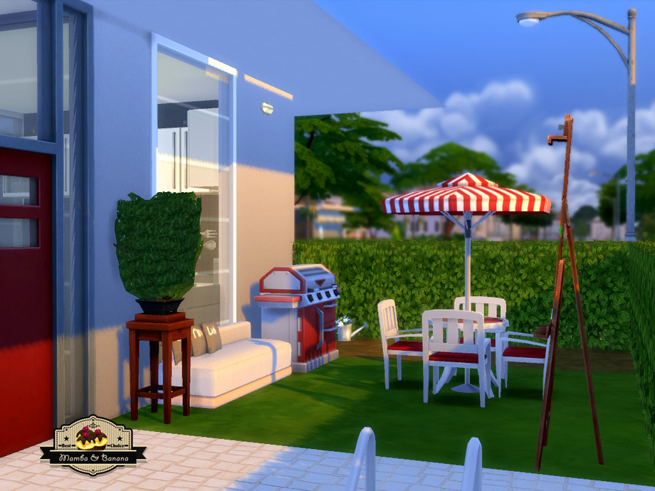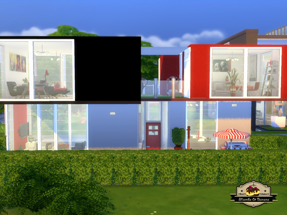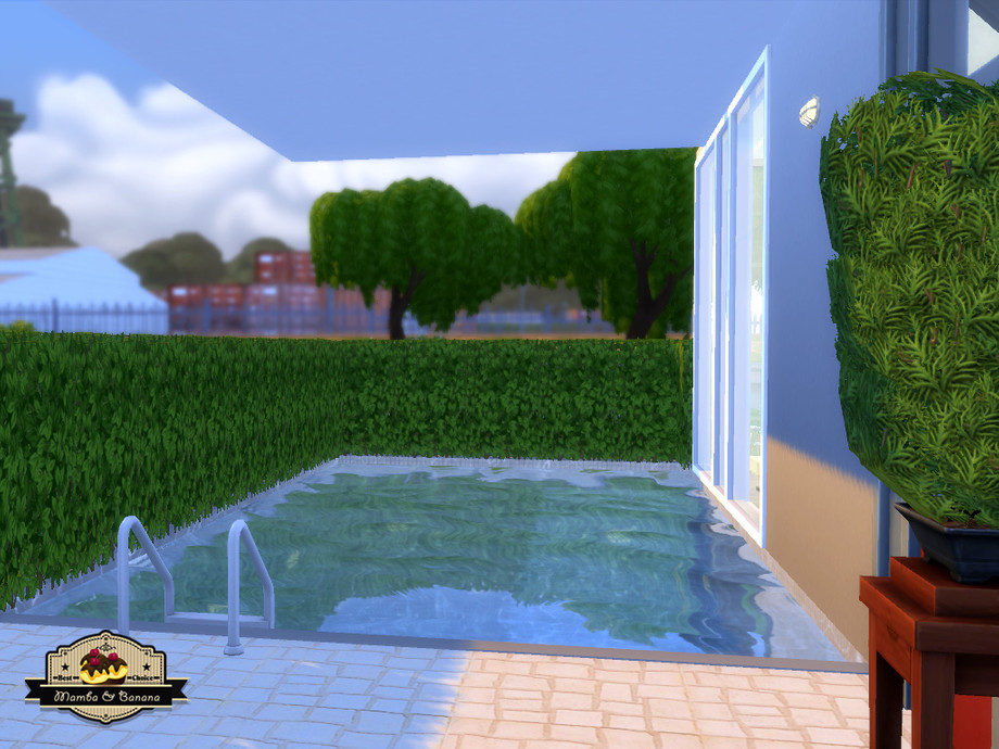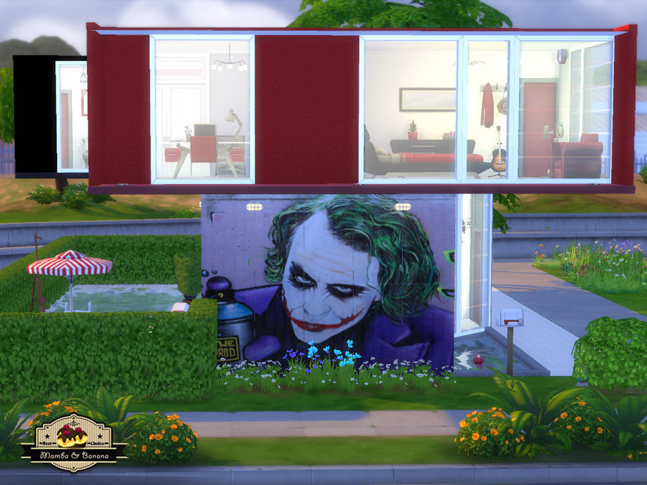Modern house with two floors, named Joker Street because of the graffiti on the outer wall. The first floor includes a kitchen, living room and small bathroom. The second floor has two bedrooms, two bathrooms and a study. The yard is landscaped around the terrace with barbeque, a swimming pool and garden. 156.000 Simoleons on a 20x15 lot.
