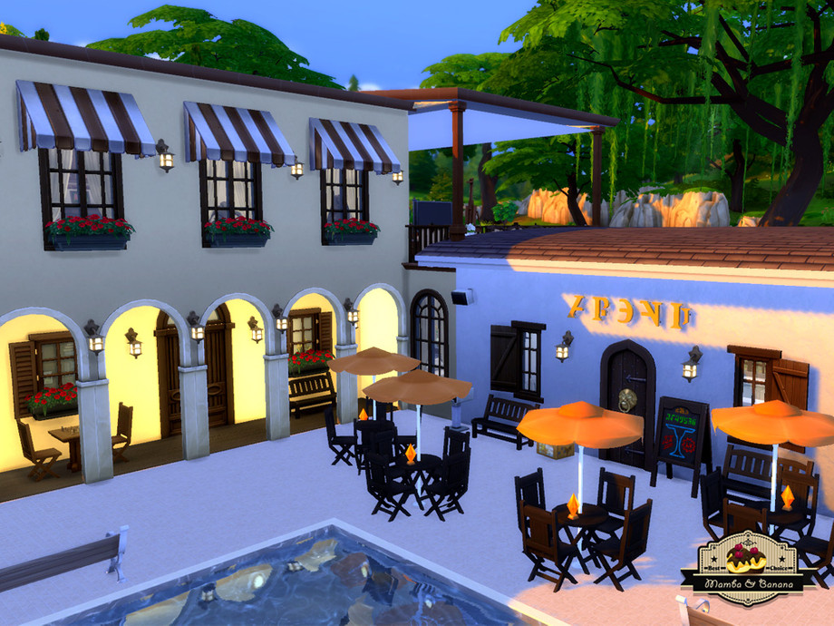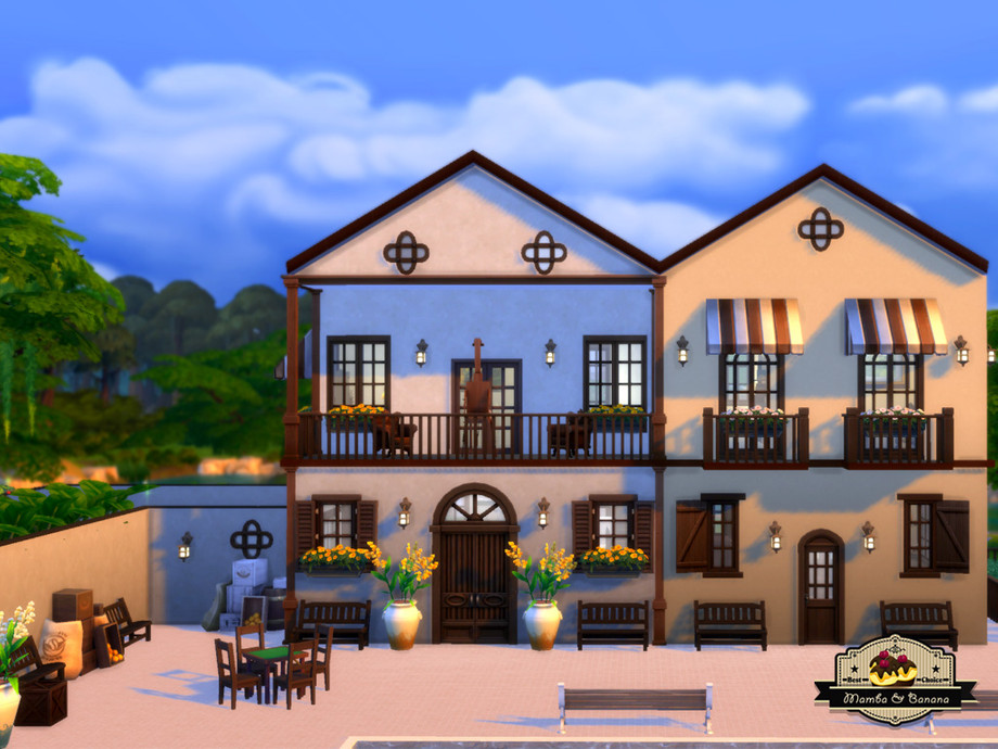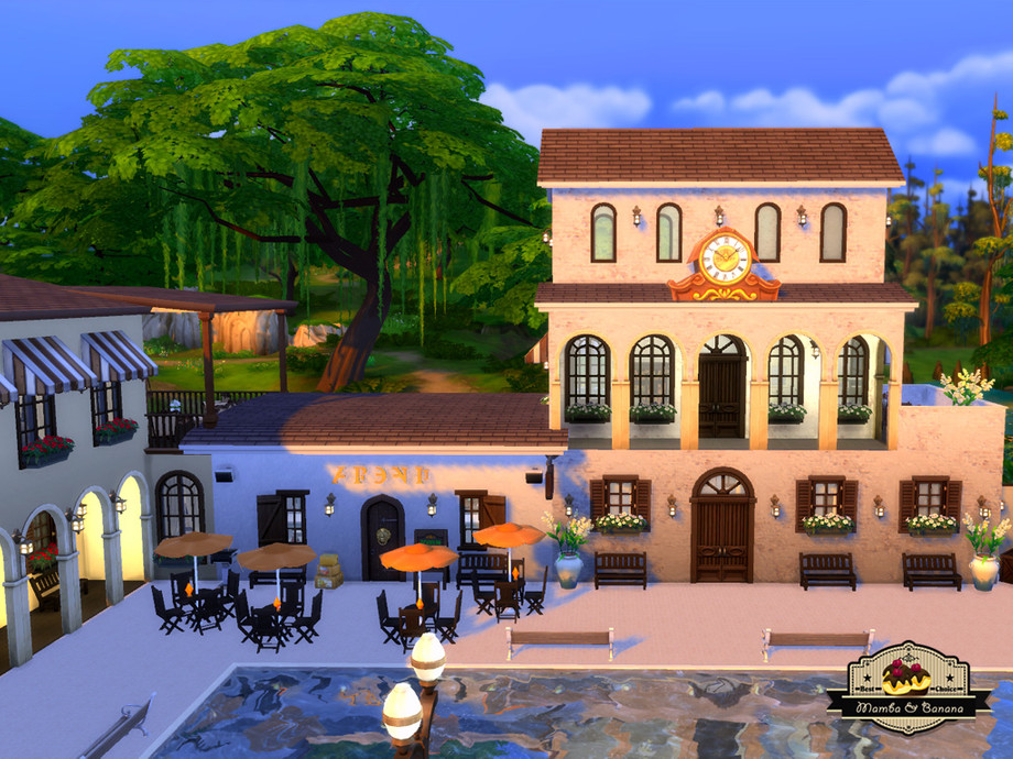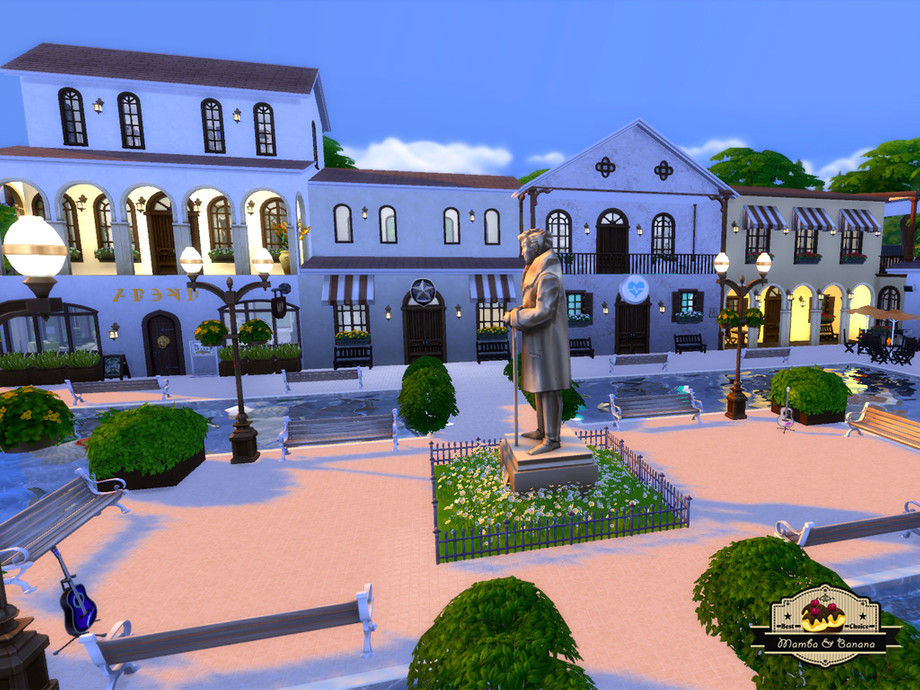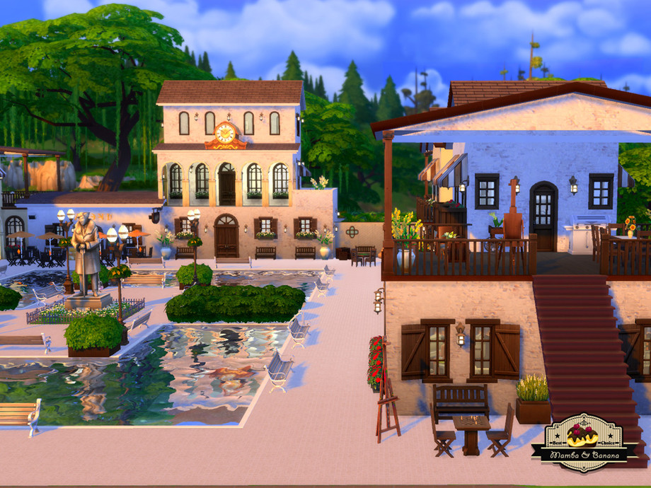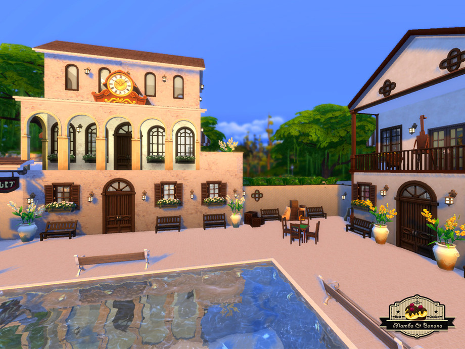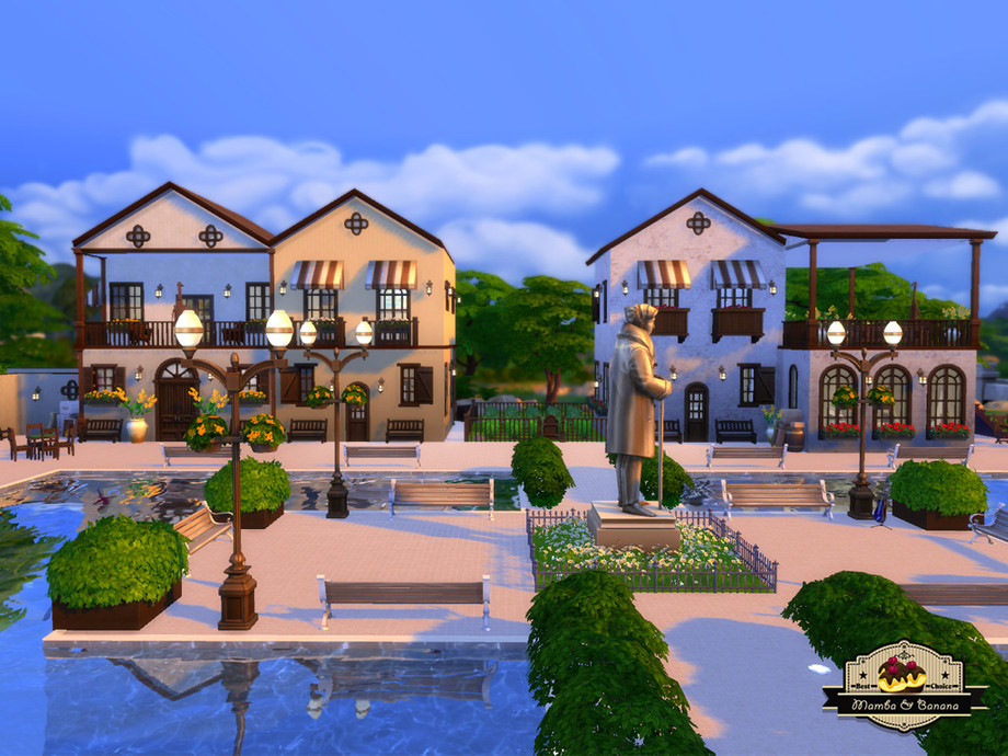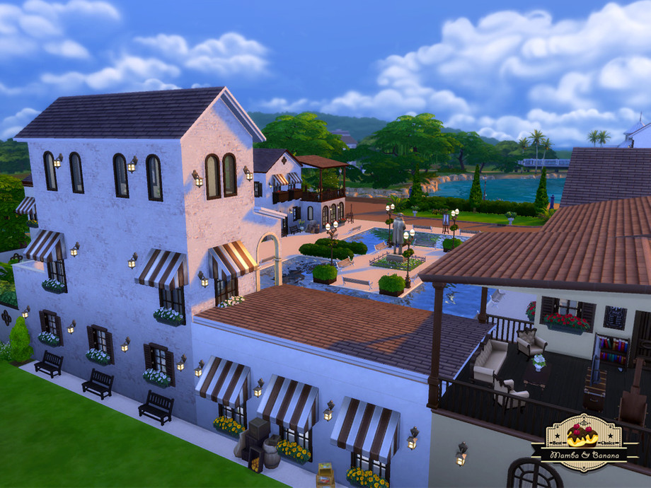 It is a warm village that has five houses for live, areas for gardeners, a bar, area for doctors, for detective, a pastry shop, a clothing store and an art shop. Outside there is a central area with a plaza and a large pool for residents and visitors. There are a total of five bedrooms and six bathrooms. The interiors are totally decorated, although by the format of the rise I have not been able to show more images. The village is very cozy and you can customize it with all those shops that you like. The creation don't have custom content.