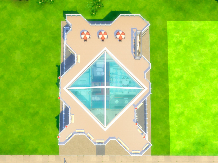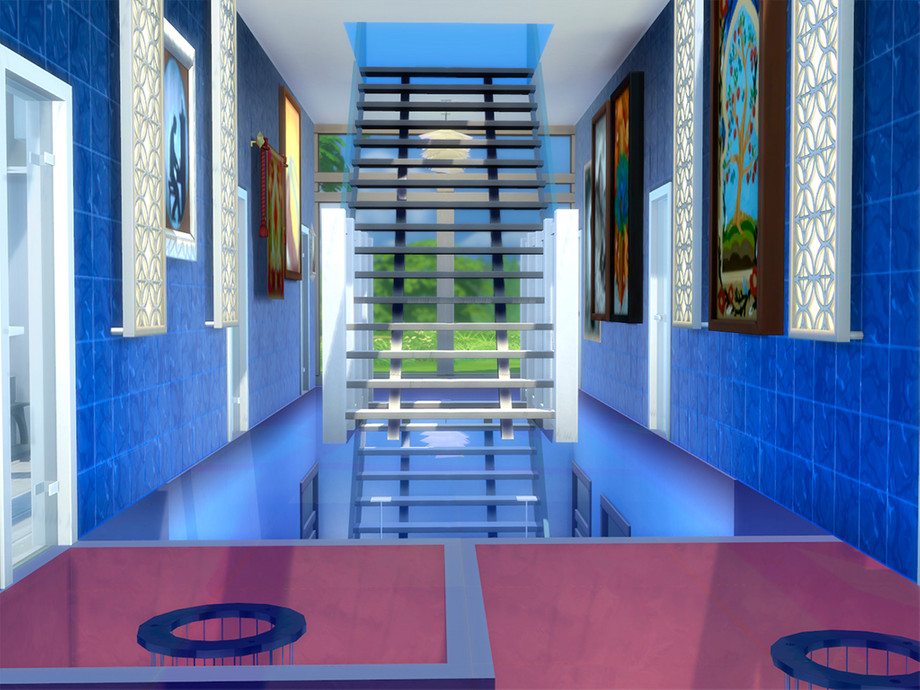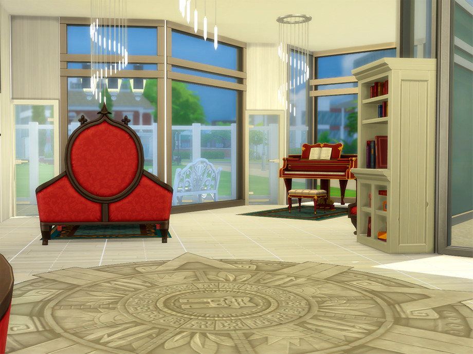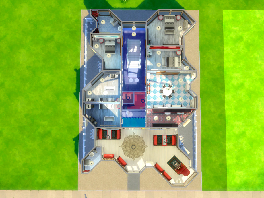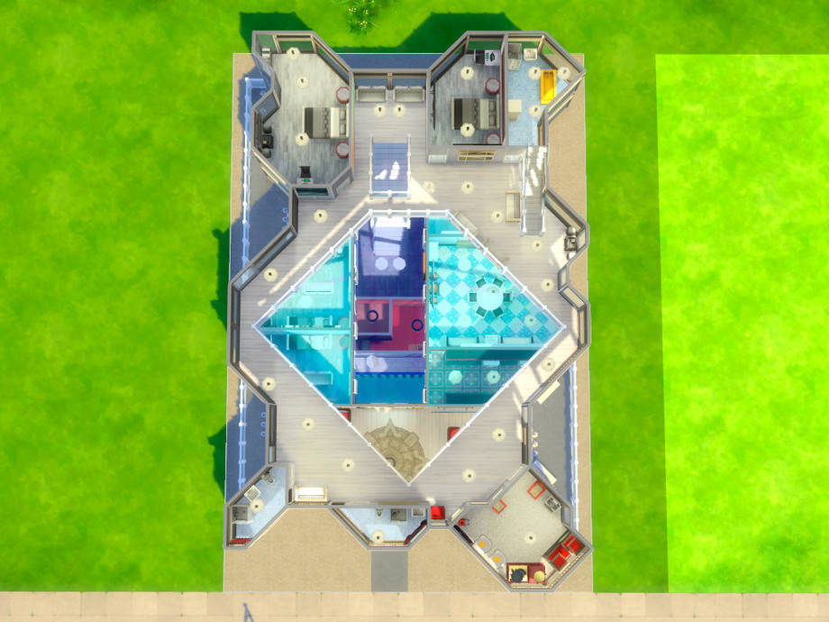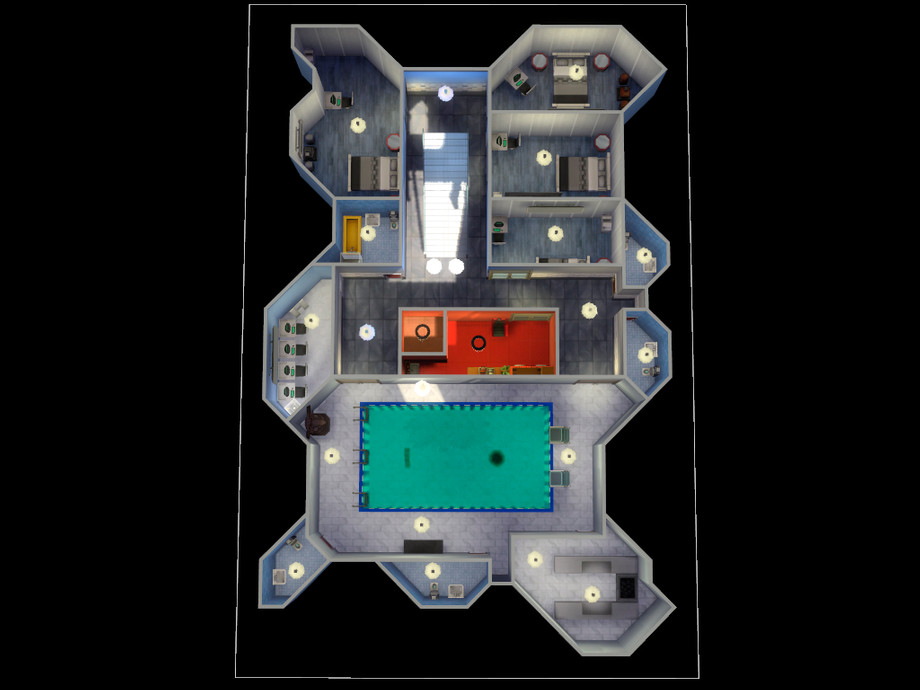 a big swimming pool. a sauna room. 5 bathrooms. (4 small one medium size) a big laundry room. 4 bedrooms (3 with big beds one for a single sim)