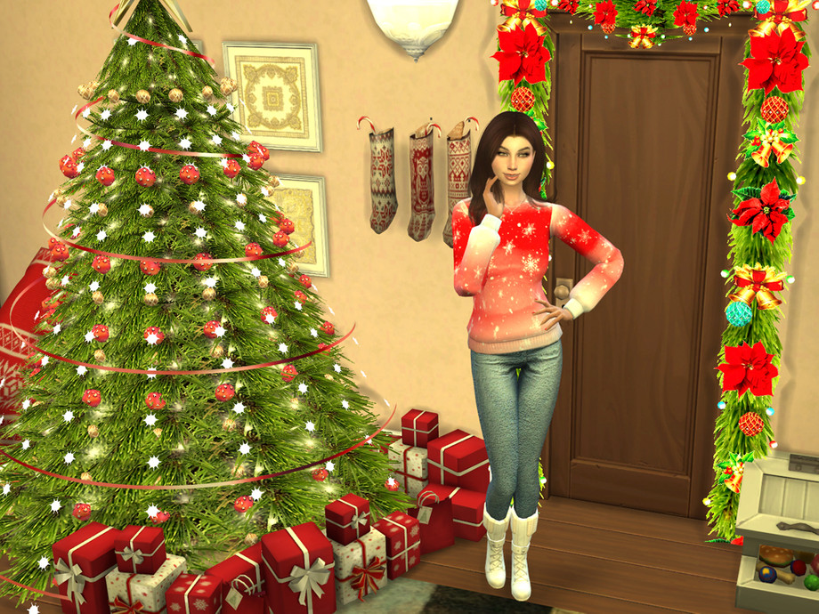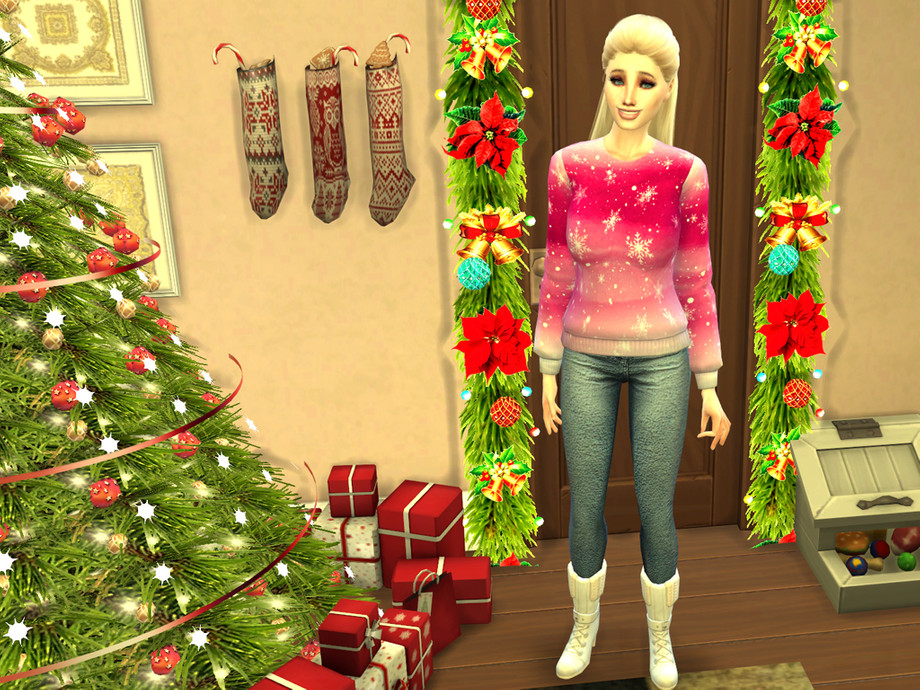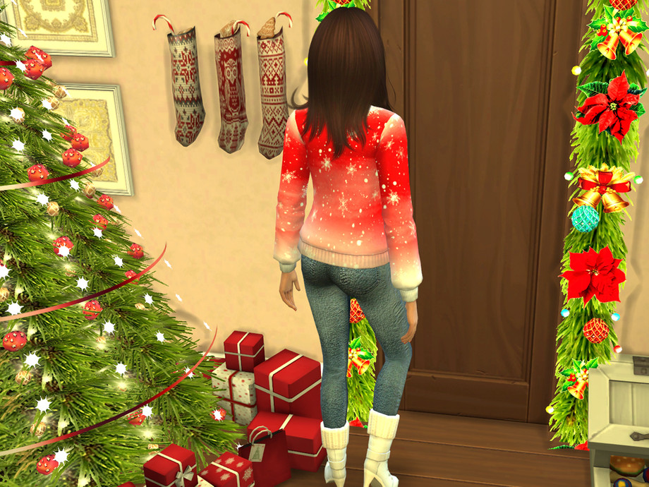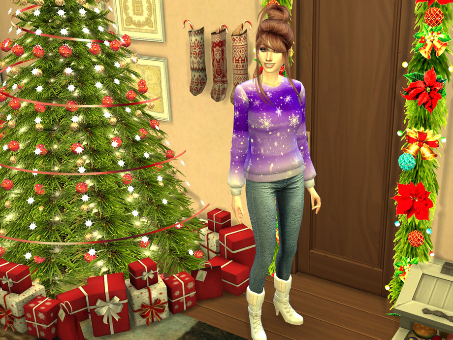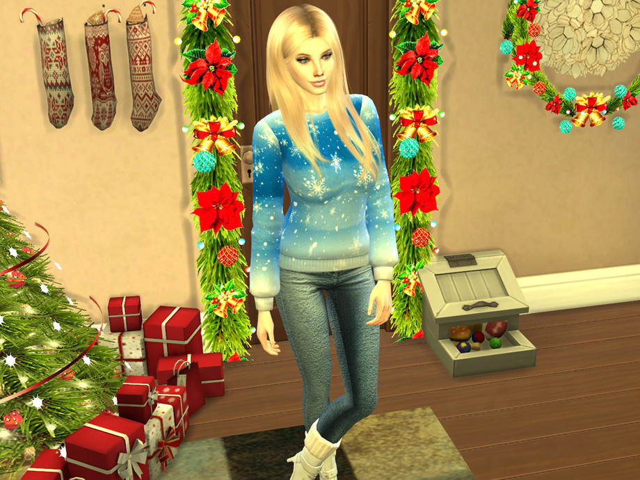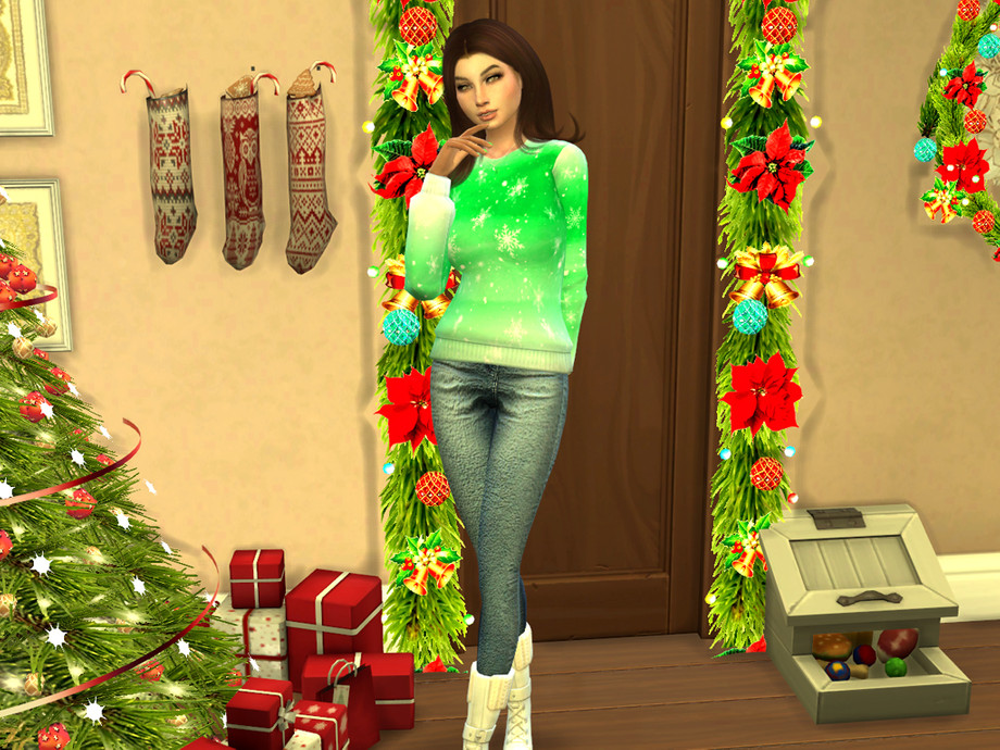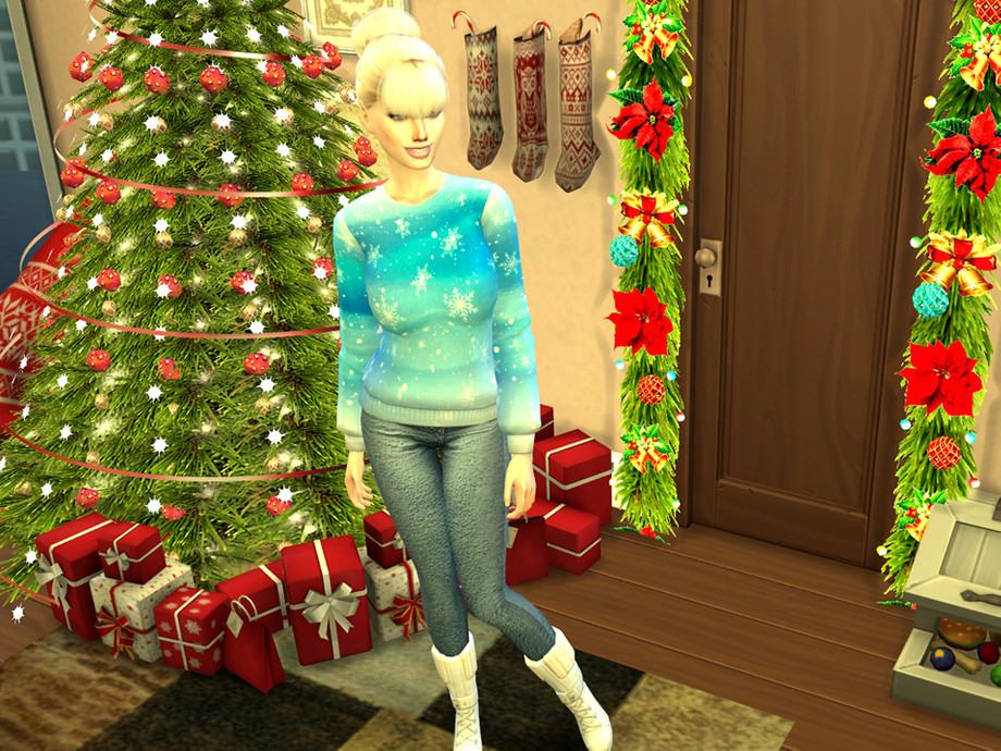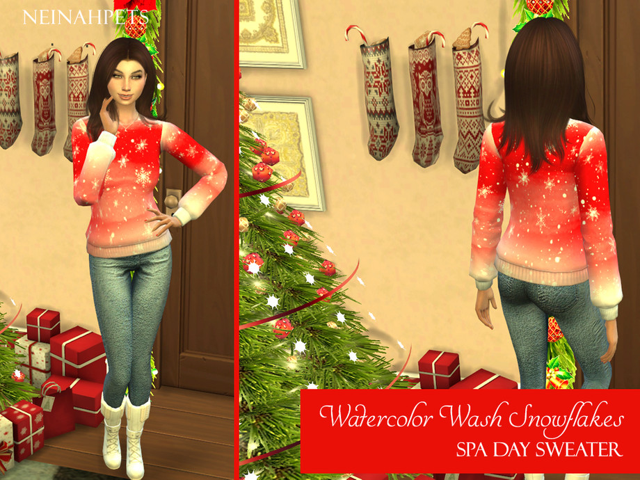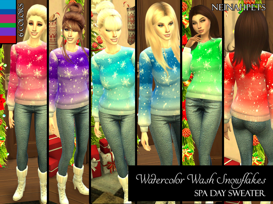 Colorful watercolor wash accented by big decorative white snowflakes and snow makes this sweater top the perfect gift for your Sim this holiday season! Available in 6 colors!