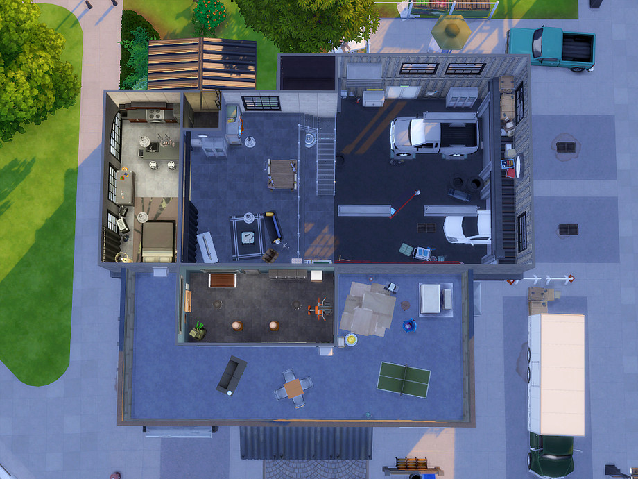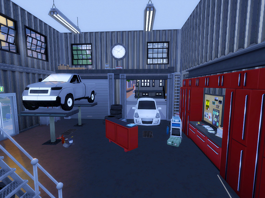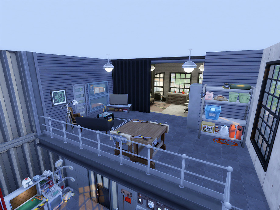 It features one very large garage with everything a mechanic could wish for, including a fake car lift, a robotics workstation and a chemical analyzer.