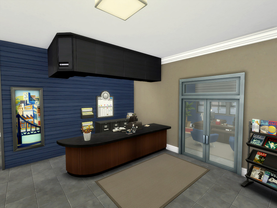 Upon entering the mechanic shop's front doors you will be greeted by a front desk and a waiting area decorated with fake ATMs and bulletin boards.