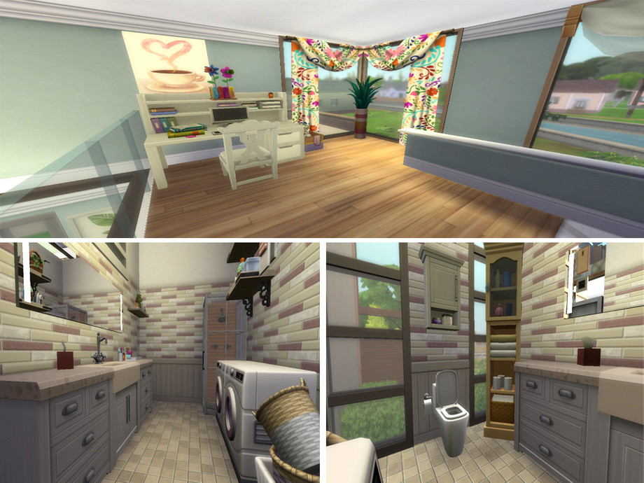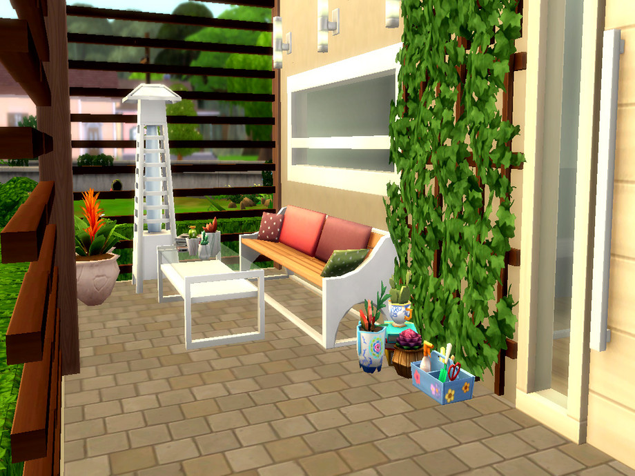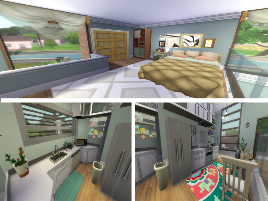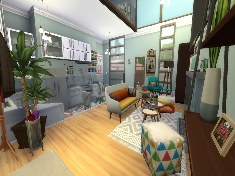 This lovely loft is ideal for a single sim (preferably female). Mostly because the bedroom is small and the bed cant be placed in a way to fit two sims. It has a bathroom a spacious living room a bright kitchen, and a small backyard with a pool.