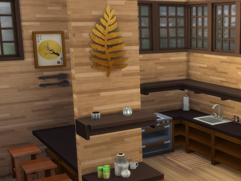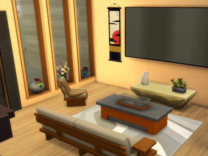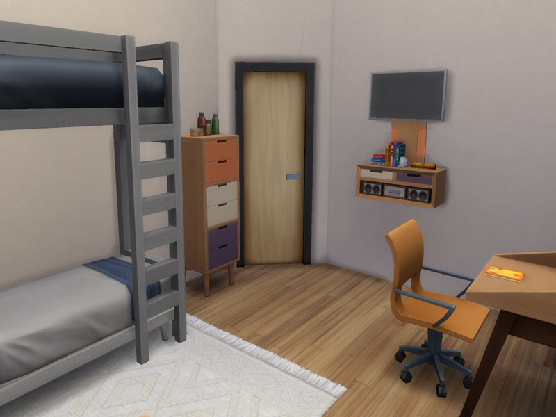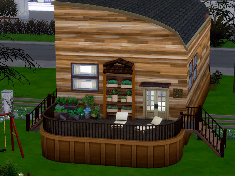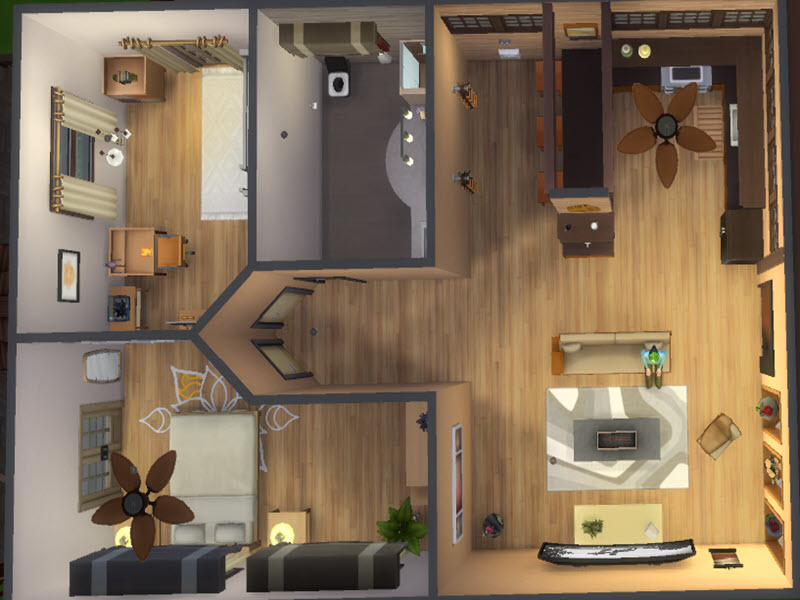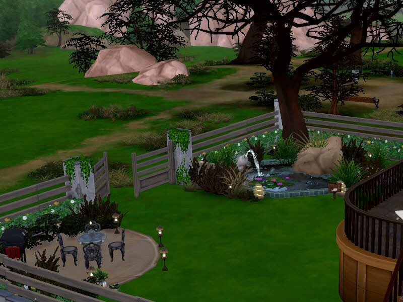 This cozy home has just enough space for a small family. It has a nice front porch and in the back yard your Sims can barbecue from their garden grill area, fish from their private pond or play on the decorated swingset. Both bedrooms have exterior doors that lead to the back yard.