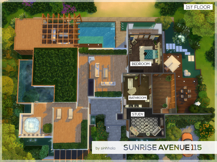 A tropical house with big natural garden and a few different water areas. Rebuild of my Sims 3 house.