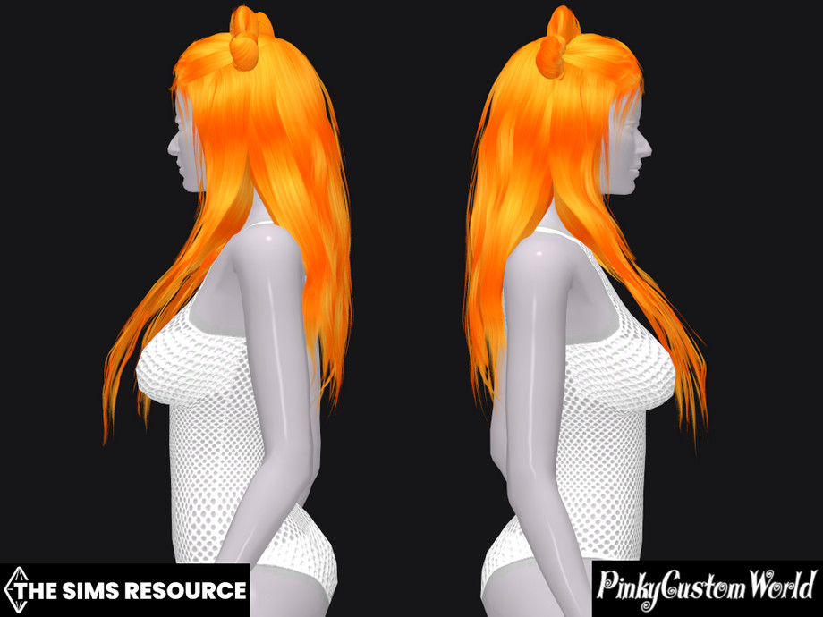 Long wavy hair with cute bow buns, recolored in unnatural colors