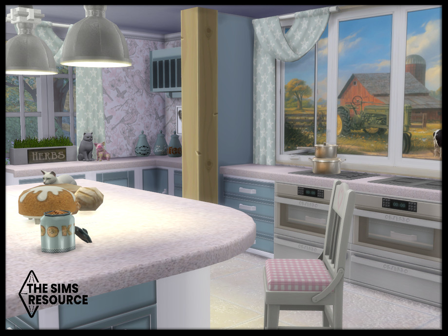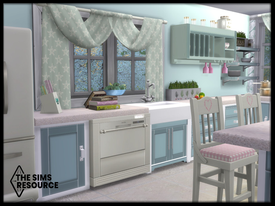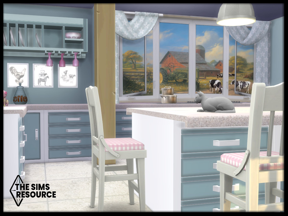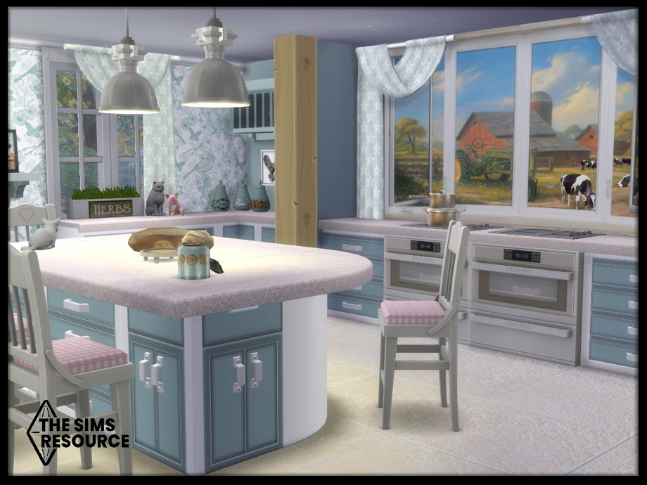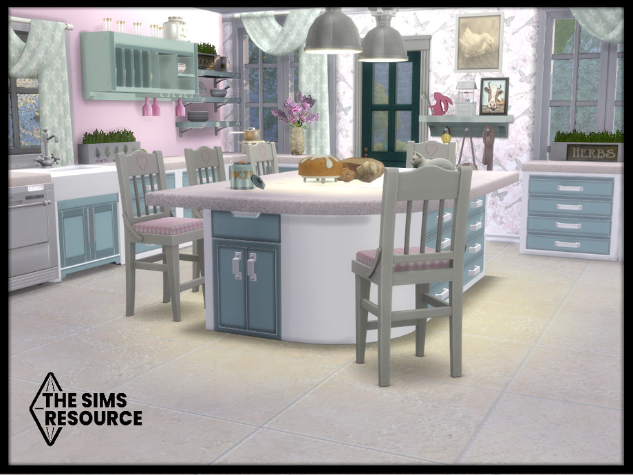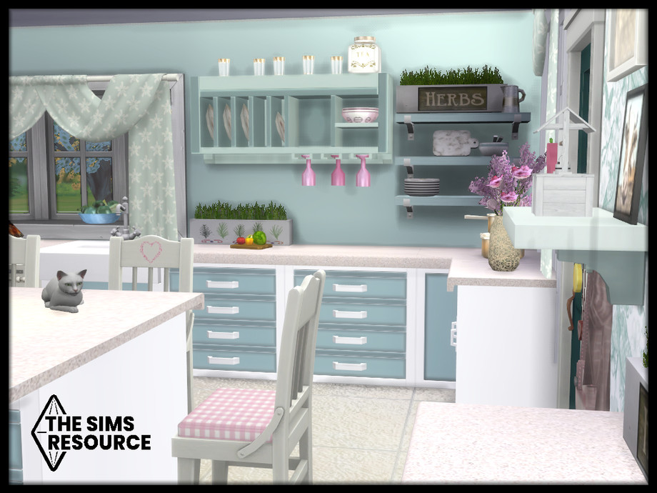 Maxis match duck egg blue farmhouse kitchen set, with hints of pink that combines traditional and contemporary pieces for that modern but lived in cozy feel. Perfect for cooks and family get togethers.