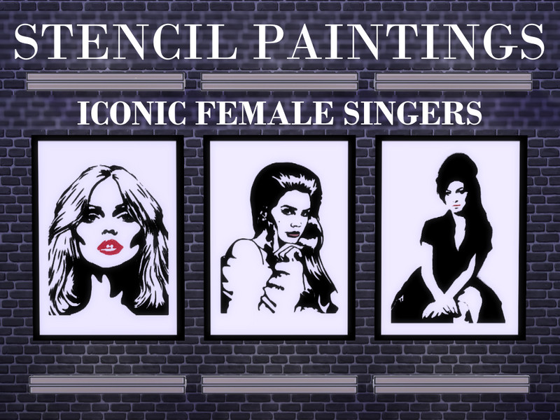 Stencil paintings of Debbie Harry, Lana Del Rey and Amy Winehouse.