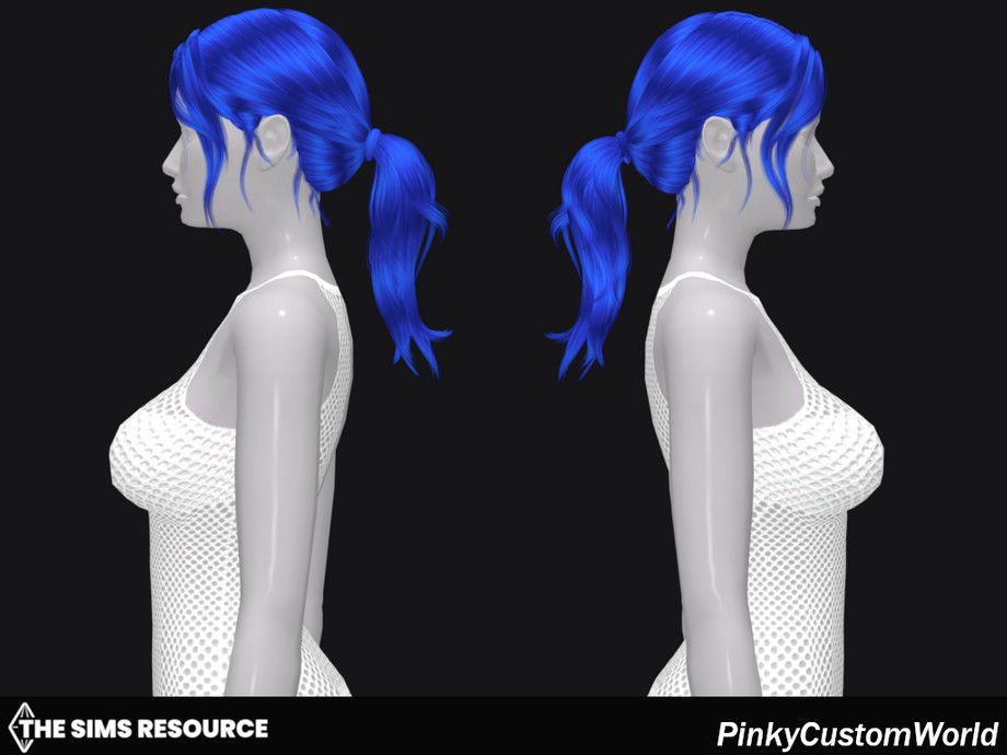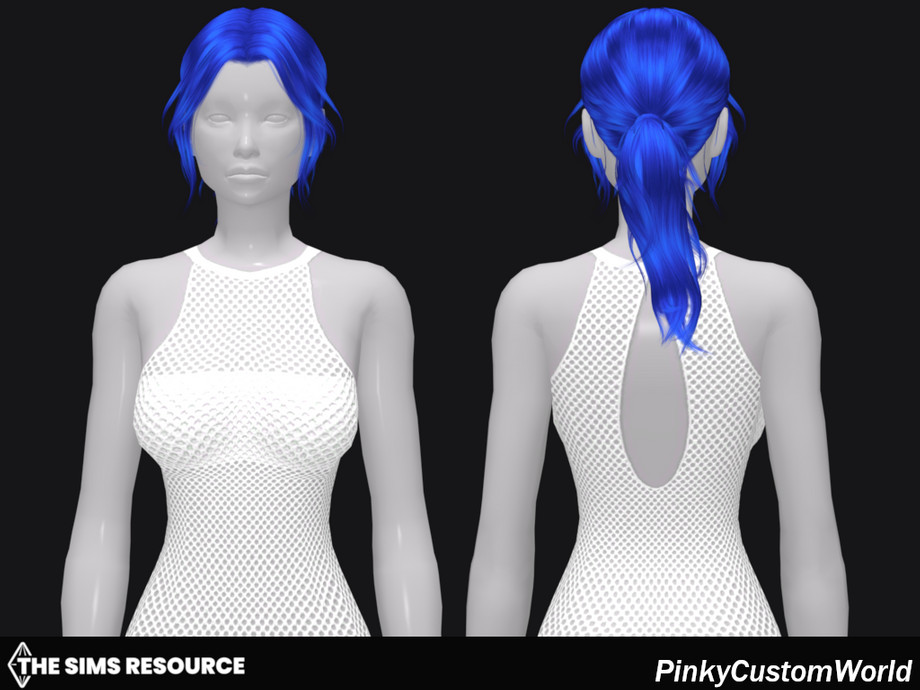 Medium lenght alpha hair set up in a ponytail with curtain bangs in the front. Recolored in both light and dark unnatural haircolors.