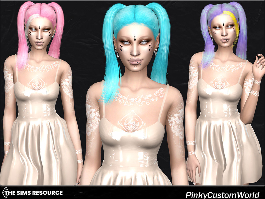 Cute medium long, high pigtails alpha hairstyle in several unnatural hair colors. The bangs are an accessory found in hats, you can download separately (see recommended tab)