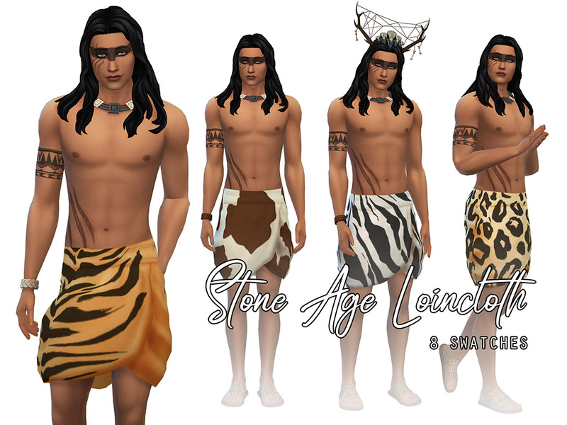 A loincloth made from animal skin. Comes in 8 color variations, including zebra, tiger, leopard, giraffe, and more. Perfect for anyone doing the Sims History Challenge!