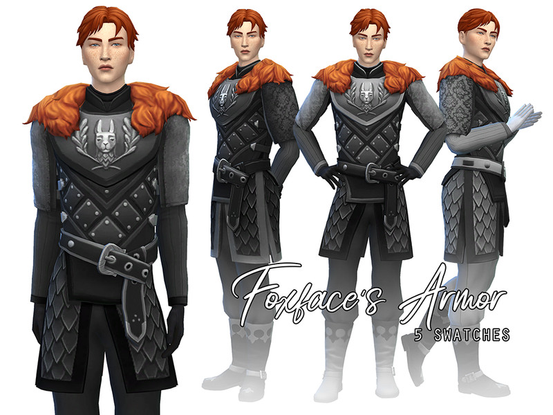 A simple recolor of the armor from Get Famous, that I made for Foxface MacKinnon, one of the members of the Thieves Guild in my Medieval town. You can find more info on my tumblr, @ my-historical-sims.