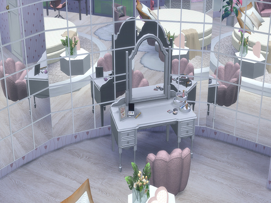 Wonderful bedroom with round comfy bed, decorated with pink mirror like your dreams !