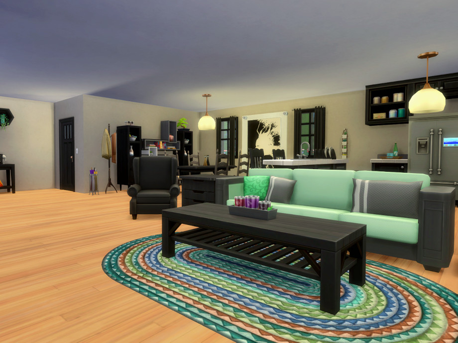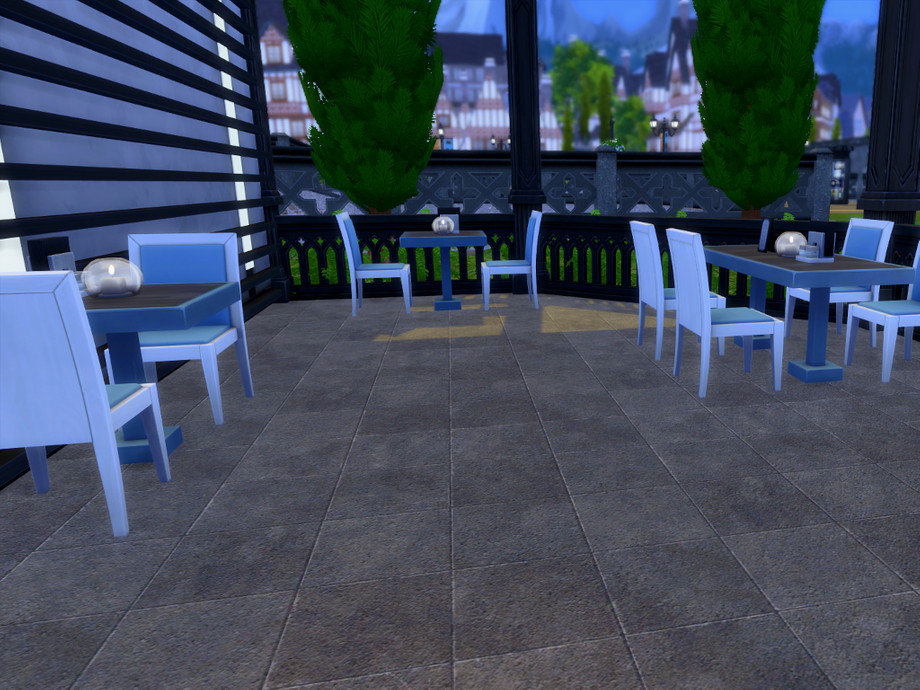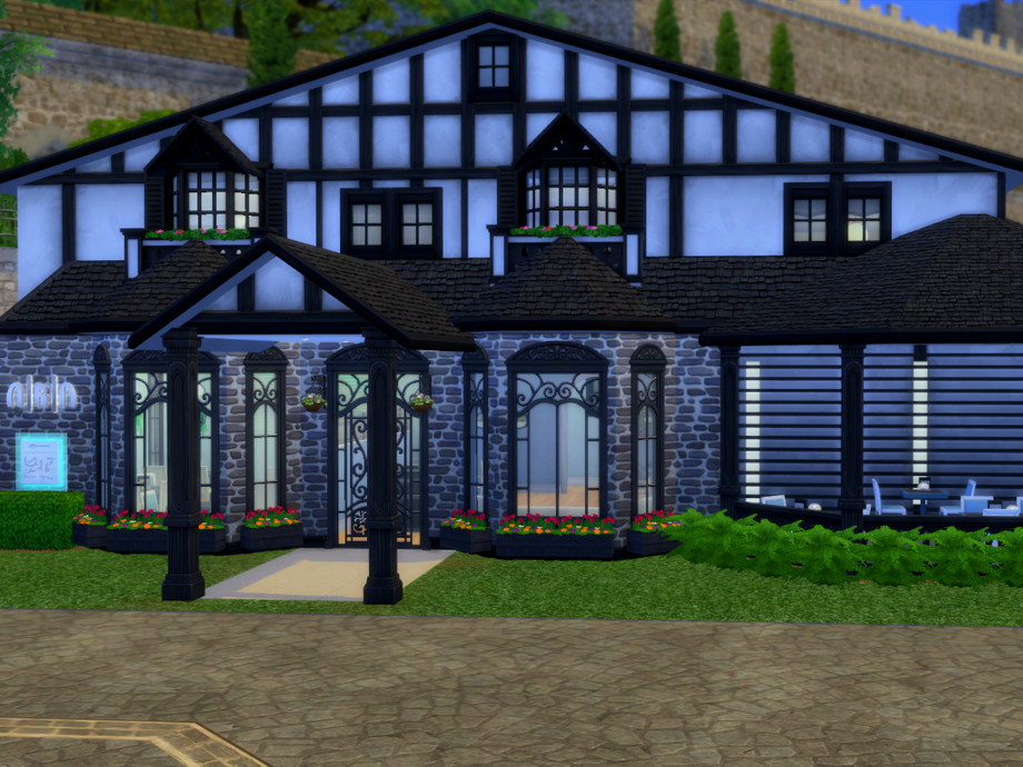 Tudor inspired but modern inside, Flavor is a no cc restaurant build decorated for casual dining including tables on an outside patio. The restaurant has a 2 bed, 1 bath apartment upstairs. The game forces you to have a separate residential lot but you can live above the restaurant - just ensure that you lock the door to the stairs to prevent your customers from invading your personal space!