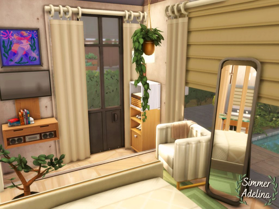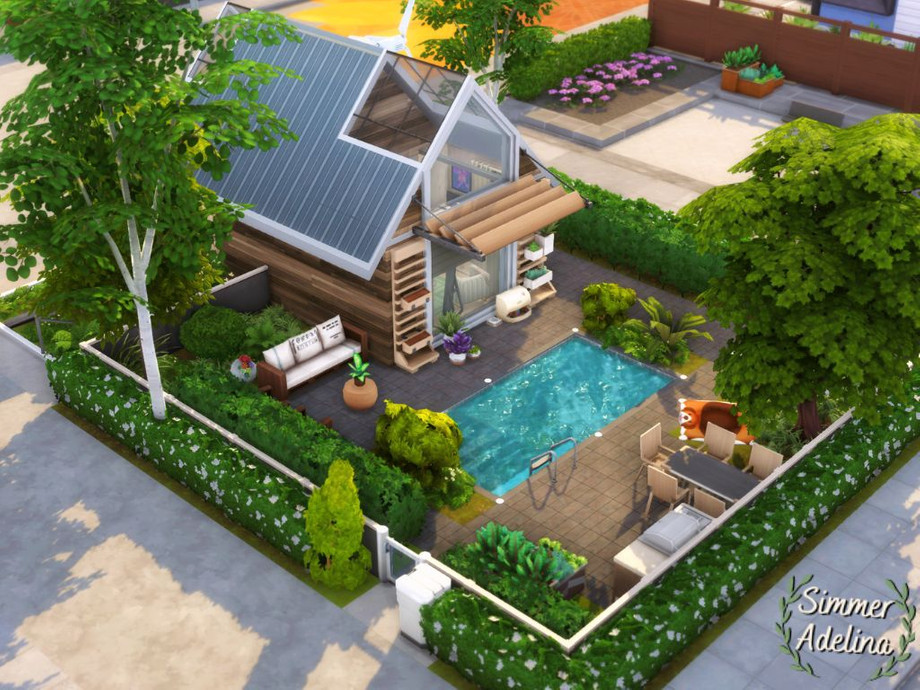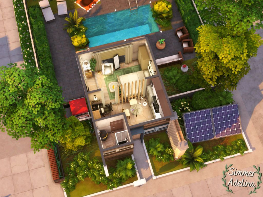 Lot's Placement: Evergreen Harbor, Canal Corner. This 32 tier home is perfect for a sim or two looking to live a quite cozy, relaxing life without worrying about the bills. The home has an open space concept for the bedroom, dining, kitchen and office area plus a full bathroom. The outside has a lot of space for relaxing, swimming and enjoying a meal. I hope you'll ENJOY it! --- PLEASE DON'T FORGET ABOUT MOVE OBJECTS ON BEFORE PLACING---