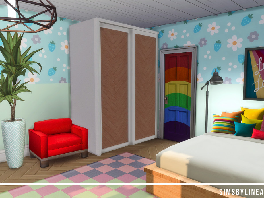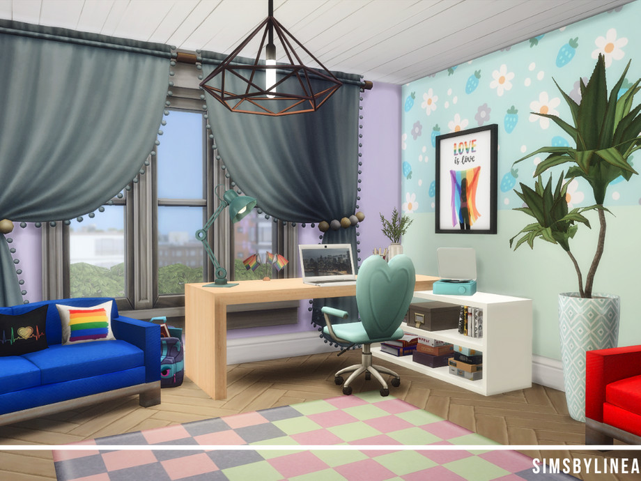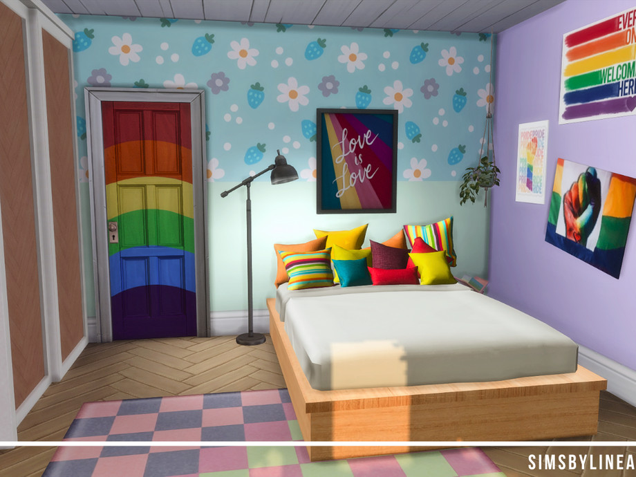 This fun and young teenage bedroom is full of patterns, colors and pride flags! The couch is the perfect space to hang out with friends, the closet is huge and the bed is cozy with lots of colorful pillows.