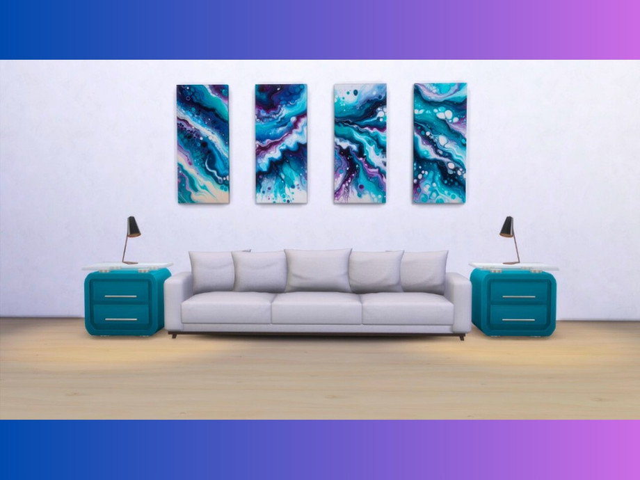 This abstract fluid art showcases swirling patterns in turquoise, teal, purple, and white. The marbled design features cell-like formations throughout, creating a flowing, wave-like appearance. The vibrant colours blend together with a dynamic diagonal movement across the canvas, resembling an oceanic or cosmic scene.