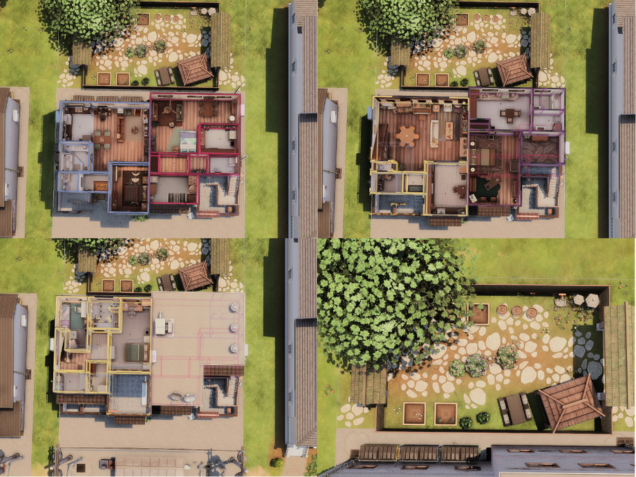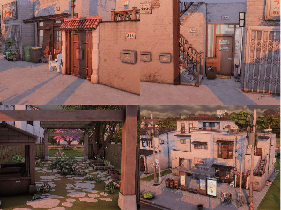 Step into modern Japanese living with this beautiful multi-apartment lot for The Sims 4, featuring four stylishly furnished apartments. Each apartment is designed to accommodate one Sim, except for one, which is perfect for a small family. The shared garden area offers a serene escape for relaxation or gardening, making it the perfect community space for Sims who enjoy outdoor activities. This no-CC lot combines minimalist Japanese design with practicality, making it a perfect home for your Sims in the city.