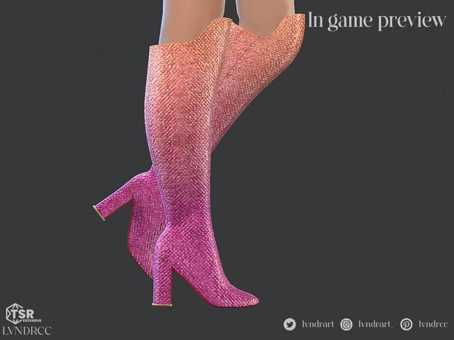 Knee length boots on a supportive hell, with shiny crystal-like finish. In a variety of intense, bright ombre, light and pastel shades.