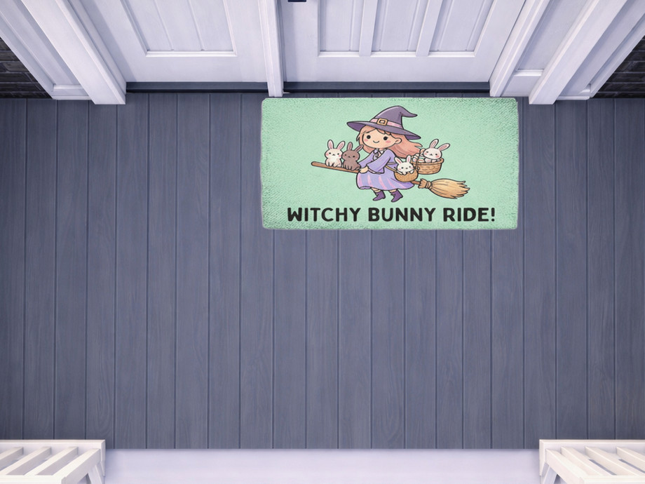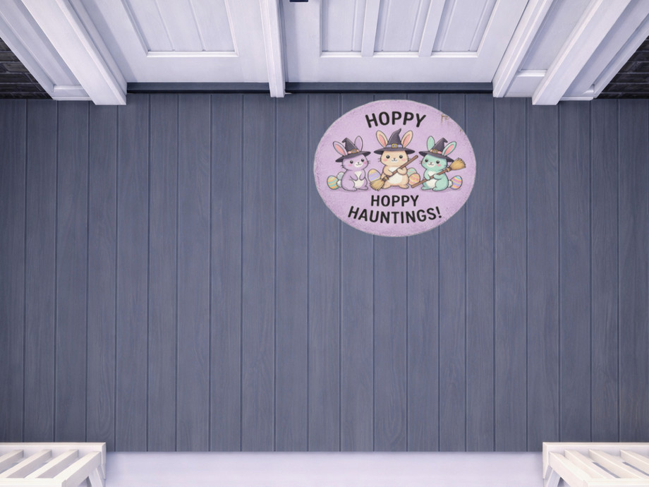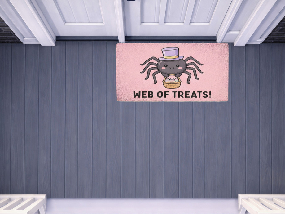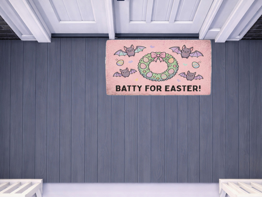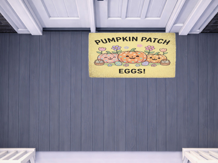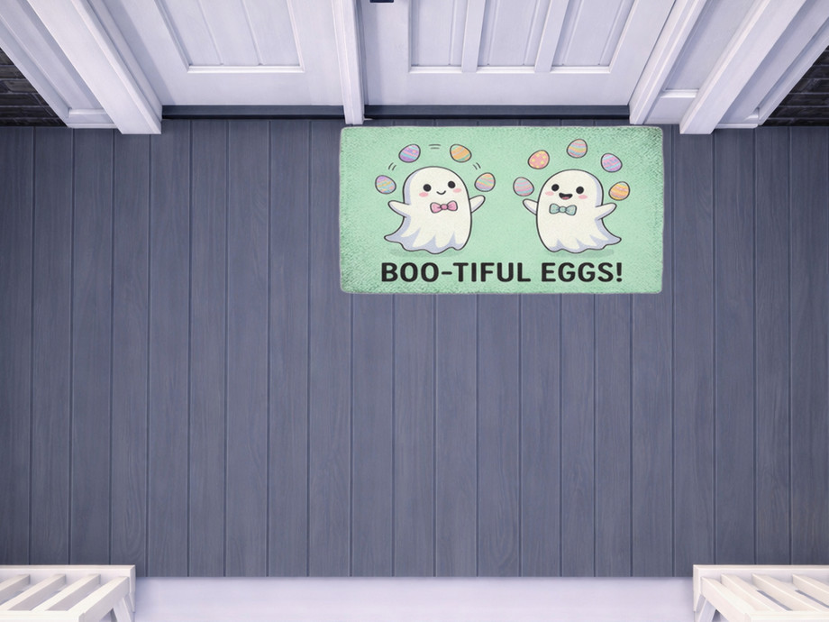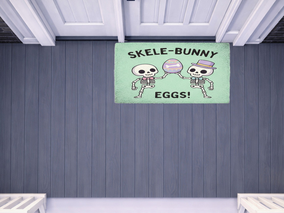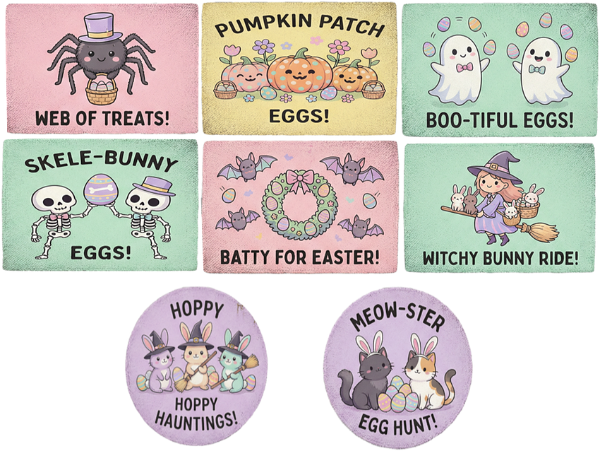 A playful blend of pastel spring charm and Halloween mischief! This 8-piece welcome mat collection features ghostly egg hunts, witchy bunnies, dapper skeletons, pumpkin patch puns, batty wreaths, and more spooky-cute designs.