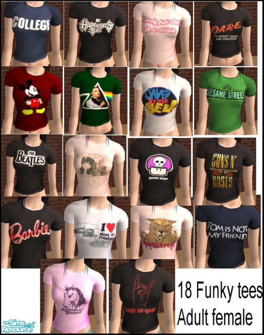 Old set from mts2. 18 fun and funky graphic tees for adult females. Maxis recolors, no mesh or EP needed. Enjoy!