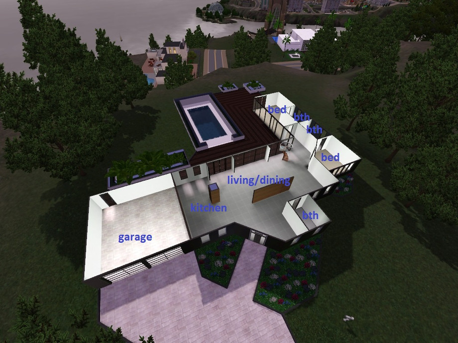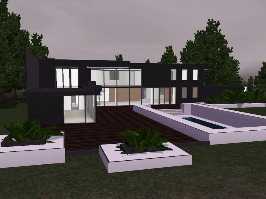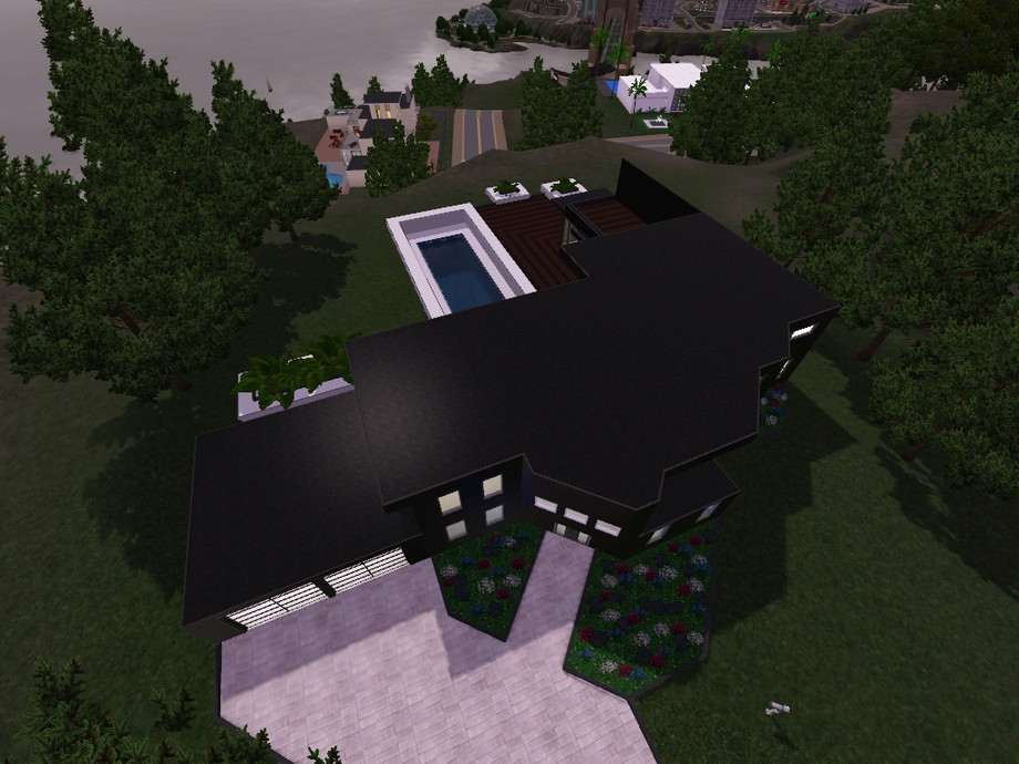 This dark, yet comfortable, home is a great asset in any sims life. With spectacular Bridgeport and ocean views, this home is perfect for entertaining or even just having a night in. The sparkling long pool is inviting to all.