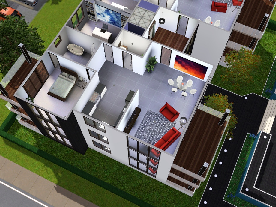 This modern six-apartment complex is perfect for any single sim or couple. Each apartment is furnished the same, with each being extremely modern yet welcoming. Each consists of an open floor plan kitchen/living/dining, bedroom with ensuite, two decks with gorgeous views, and a study. The study can be turned, if needed, into a second bedroom. There is a sparkling pool outside for everyone's enjoyment, and a single car space.