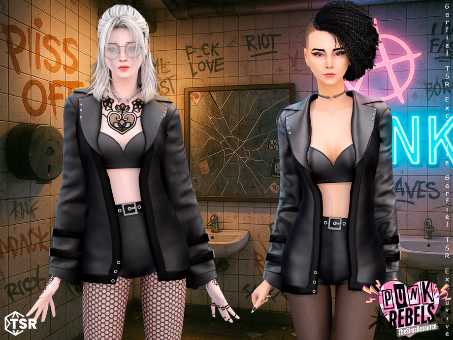 Sims 4 — Punk set with leather and latex options by Garfiel — A daring punk-inspired outfit featuring a cropped jacket