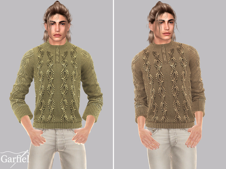 A richly detailed cable knit sweater featuring a striking raised pattern that runs along the front and sleeves. The subtle half zip neckline adds structure and a touch of practicality, while the thick ribbing keeps the silhouette neat and classic. Warm, expressive, and full of texture, this sweater is perfect for cool weather outfits or characters who need a visually strong but comfortable everyday look
