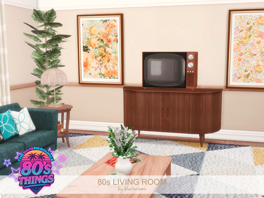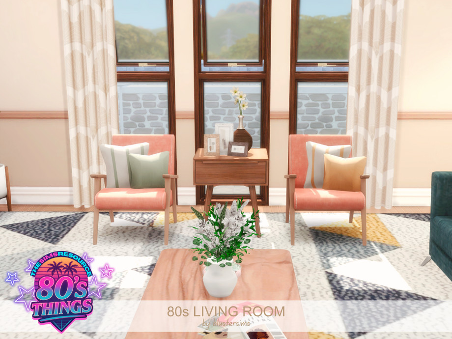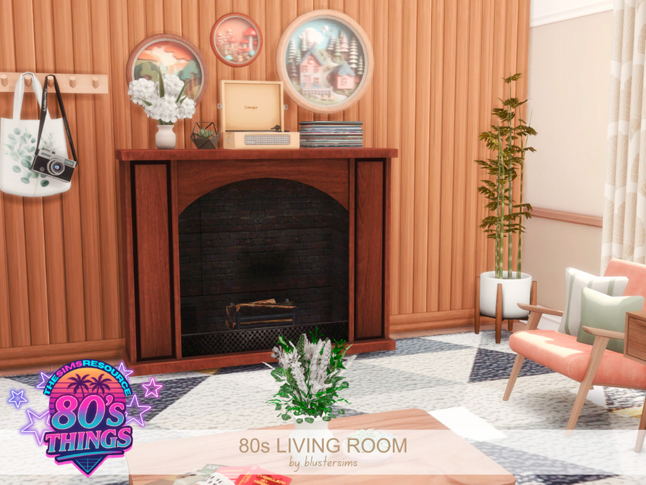 The 80s Living Room centers around a cozy brick fireplace, with a bold sitting area, geometric patterns, and retro accents like a tube TV and record player to add a nostalgic vibe.