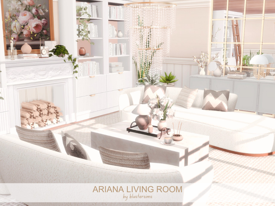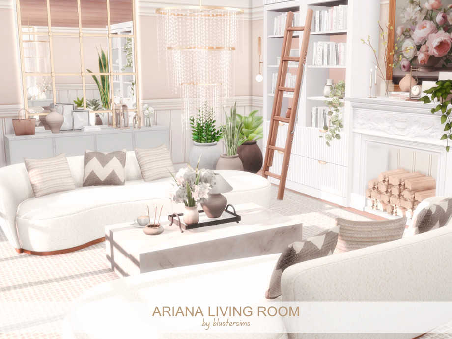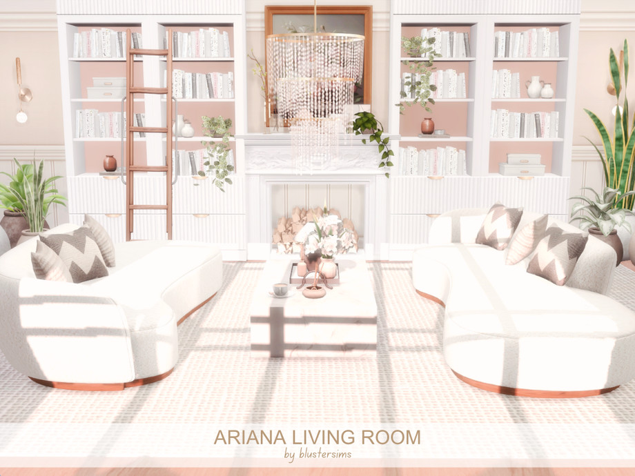 The Ariana Living Room is a bright, airy space with curved cream sofas, blush accents, built-in bookshelves, and soft greenery for a cozy, elegant feel.