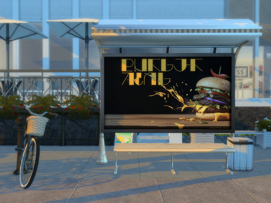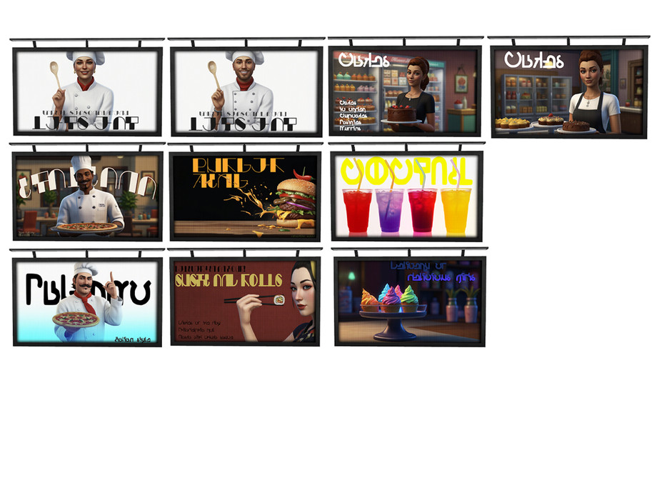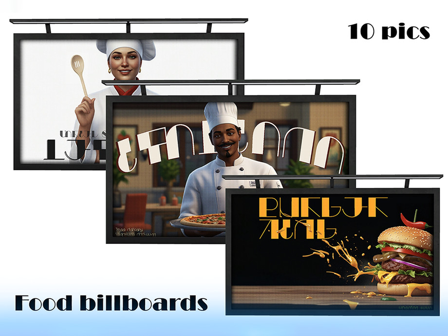 I've created 10 billboard variations for you to add even more atmosphere and realism to the game! Spice up your public spaces and let your Sims enjoy fantastic food ads in Simlish.