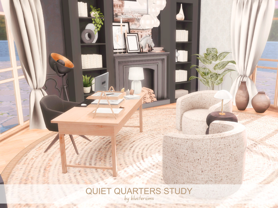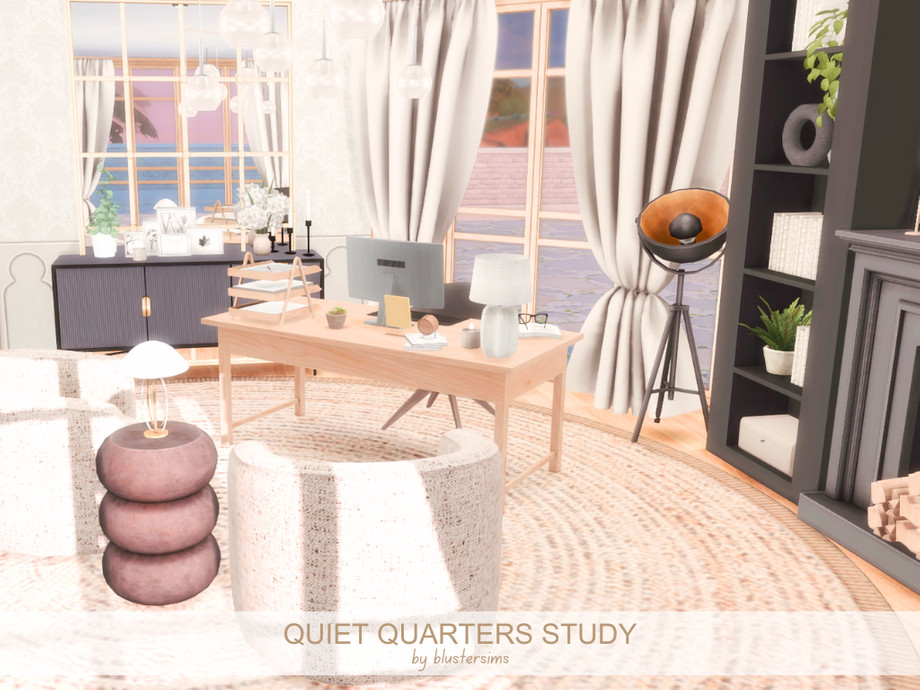 Sims 4 — Quiet Quarters Study by BlusterSims — Quiet Quarters study room with soft lighting, lined with bookshelves and